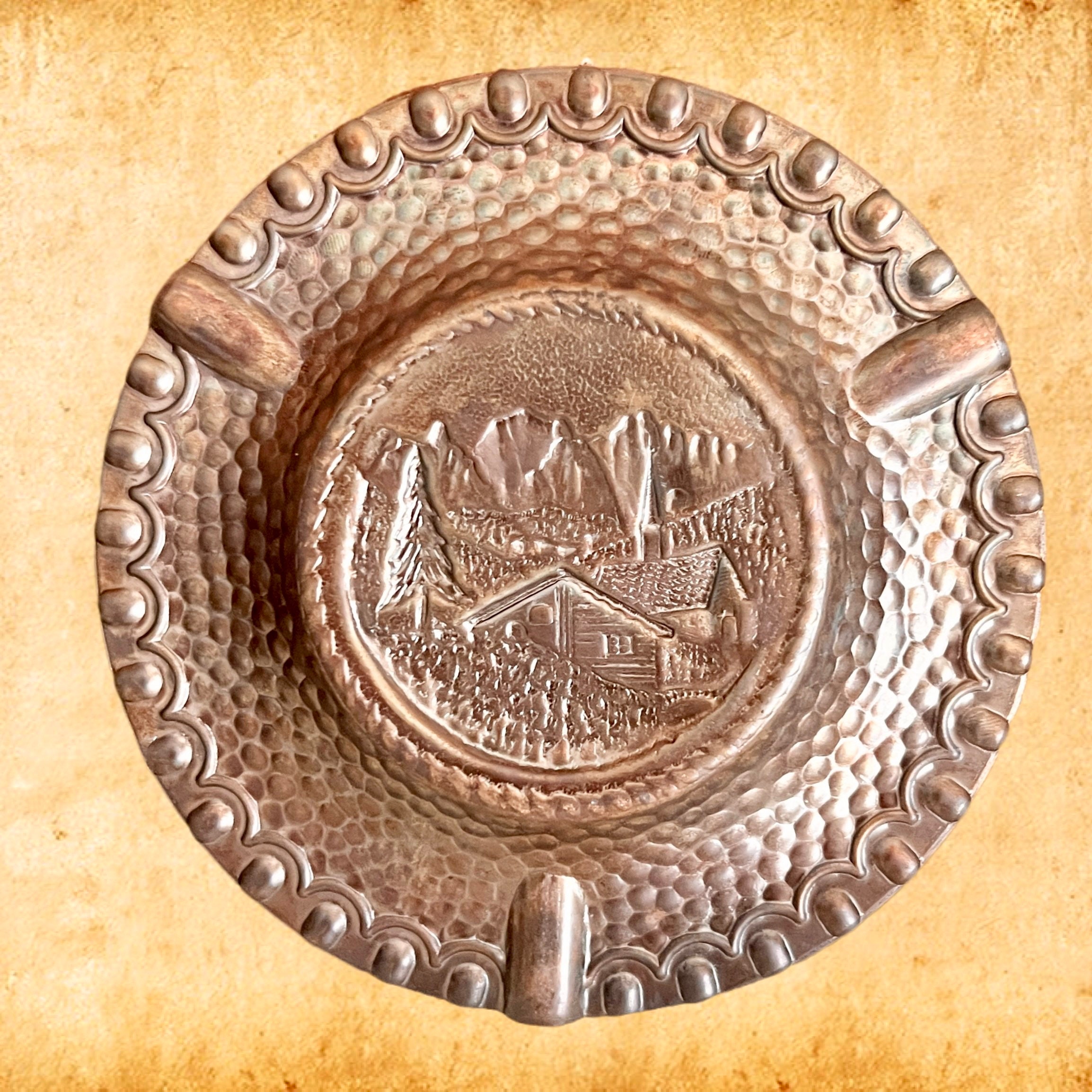 Hammered copper ashtray, vintage 1970s tobacciana featuring a mountain chalet scene. Excellent condition. Could easily double as a retro sweets or nuts dish!